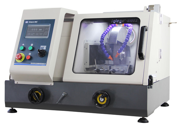 iqiege®-6100Z型手自一體式切割機是由機身、電控箱、切割室、電機、冷卻系統、切割砂輪片等部件組成。本切割機不但可以切割直徑為100mm以內的圓形工件,還可以切割高70mm、寬100mm以內的長方形試樣。另外,本機可根據鋸片消耗量,實時調整主軸高度。該機通過冷卻系統對試樣進行冷卻,以防止試樣在切割過程中過熱而燒壞組織。該機可以切割試樣選擇3種不同的切割模式,并能對切割進給速度和切割行程進行設定,從而提高了切割試樣的質量。該機分手動切割和自動切割。并具有安全保護和運行提示功能,更便于人機的對話。大容積的切割室,更便于切割者使用,是大專院校、工廠企業金相試驗必備的取樣設備之一。